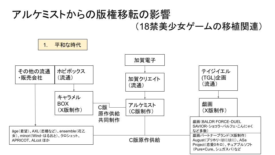 北海道・札幌を本拠地として(その後本社事業所は千葉県→東京都に)、いわゆる「コンシューマー向け美少女ゲーム」を制作していた会社「アルケミスト」。2002年の『君が望む永遠』のコンシューマー化をきっかけに、美少女ゲームの移植制作に本腰を入れ、その後いわゆる「戯画」やそのパートナーブランドの作品を中心に、さまざまな作品をコンシューマー基盤に移植し、一定の地位を築き上げた。(図1:「平和な時代」)