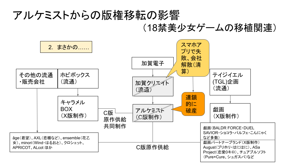 しかし、一見順調に見えた「アルケミスト」社だが、私から見る限り、『乙女はお姉さまに恋してる Portable ~2人のエルダー』の限定版や、オリジナル作品である『ぎゃる☆がん』など、売れそうな(※実際売れた)作品の初期出荷数を少なく見積もりすぎるなど、センスのなさが垣間見えていたところ、2015年に携帯電話用アプリの販売不調で業績不振に陥り、2015年12月31日をもって会社解散を余儀なくされた。この影響をもろに受けたのが「アルケミスト」社で、2016年年初に倒産を発表、同年4月5日には札幌地裁から自己破産宣告を受け、会社が消滅する、という事態になった。(図2:まさかの……)