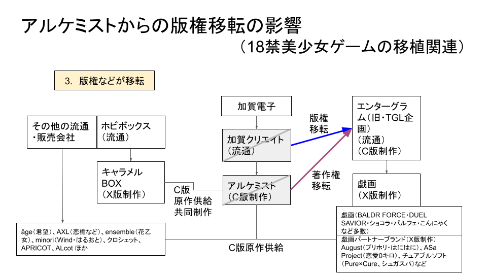 この結果、「アルケミスト」社が持っていた各種ソフトの著作権、ならびに「加賀クリエイト」社が持っていた版権は、「アルケミスト」社が手がけた作品に「戯画」ならびにそのパートナーブランドのものが多かったこともあってか、「戯画」ブランドを持つ「エンターグラム」(旧名である「テイジイエル(TGL)企画」の方がピンと来る方もいらっしゃるかと、この版権ならびに著作権譲渡の段階で、業態変更もあり、2016年4月1日に社名変更)に引き継がれることになったのである。(図3:版権などが移転)