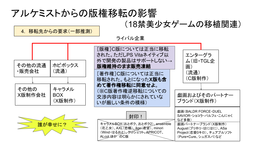 しかし、話はそれだけでは終わらなかった。版権の「凍結」をいわゆる「モノ質」として、著作権を、それもX版の著作権も含めて移転せよ、と要求してきたのである(のちほど述べる事実から、この部分はほぼ確定的)。(図4:移転先からの要求(一部推測))