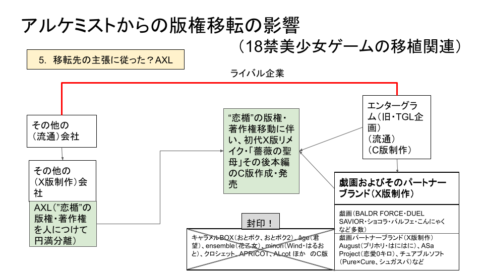 この(個人的には「過大な」と思う)要求に、「男の娘ゲーム・キャンペーン」対象作品のX版の制作ブランドで、ひとつだけ応じたところがある。それが、『恋する乙女と守護の楯』(通称・「恋楯」)およびその続編を作成した「AXL」ブランドである。「AXL」ブランドは2019年、原画家であった瀬之本久史氏がブランドを離れるのにあたり、この「恋楯」関連作品の著作権を「Team AIGIS」に移転する形を取り、最終的に版権も「エンターグラム」に譲渡したのである(図で「円満分離」と書いているのはそのため、なお二作目「薔薇の聖母」のX版、ならびに一作目のスマートフォン版に関してだけは、関連する版権・著作権がAXLブランドに残っていることがAXLブランドのサイトから判別できる)。それまで版権を凍結し「モノ質」にとっていたことから急転直下、2020年には「薔薇の聖母」のC版、一作目のX版(リメイク版)が立て続けに発売され、その後一作目のC版も発売されている。この取り込みの速さは、さきほど書いた「移転先からの要求」の推測内容の正しさを裏付けするものと考えられる。(図5:移転先の要求に応じた?AXL)