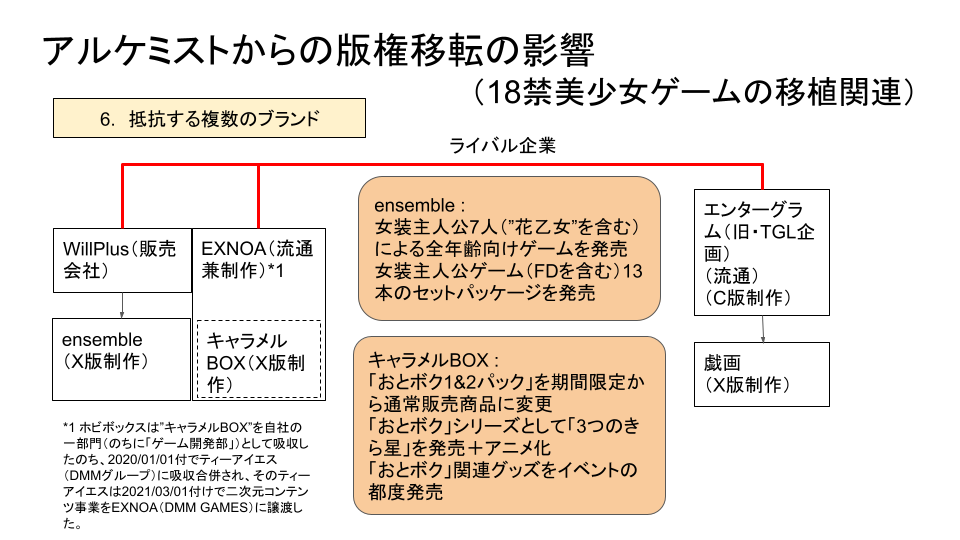 次に ホビボックス→ティーアイエス→EXNOA(この移転については図6に示したが、実は2010年の時点でキャラメルBOXはホビボックスの一部隊になっており、2011年には「ソフト開発部」として完全に吸収されている) - キャラメルBOX 側であるが、こちらの反抗は極めて徹底的だ。毎年夏冬に『処女はお姉さまに恋してる』(通称「おとボク」)シリーズを中心としたグッズの販売を行い続けるほか、一・二作目のX版を統合した『処女はお姉さまに恋してる 1&2バック』は、当初は期間限定販売の予定だったが、現在ではパッケージ版として常時流通されている。この二作品のC版(※註:PSP版に限定)がキャラメルBOXとアルケミストとの共同作業により作られたこともあり、著作権移転には断固として対抗する、という強烈な意思表示だ。さらに2018年2月にはシリーズ三作目「3つのきら星(トリンクルスターズ)」を発売、しかも今冬そのアニメ化作品(OVA)まで発売するという。このOVAの著作権表示は「EXNOA LLC」すなわち「合同会社EXNOA」そのもの(製作会社側サイトの著作権表記は「KINEMATICS」に改められたので、作品全体の著作権は二社表示になる可能性がある)である。すなわち、このアニメ化は「自作自演」とも言えるのである。そこまでしてでも、と驚くばかりの反抗ぶりだ。